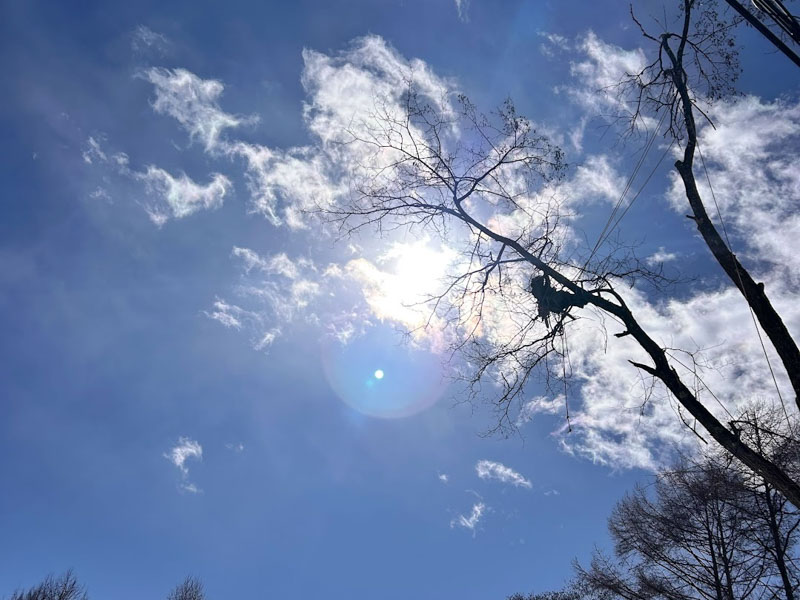 高く高く成長したカラマツやナラの木など、特に別荘地では倒木に備えて伐採するケースも多いです。クライマーが木に実際に登りロープワークで少しずつ切り落とします。枯れてしまって登れない木はクレーン伐採で対処します。