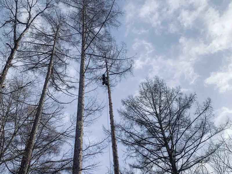高く高く成長したカラマツやナラの木など、特に別荘地では倒木に備えて伐採するケースも多いです。クライマーが木に実際に登りロープワークで少しずつ切り落とします。枯れてしまって登れない木はクレーン伐採で対処します。