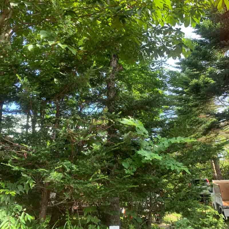 中軽井沢の住宅地で電線に干渉してしまっているモミの枝払いを特殊伐採で対応させていただきました。